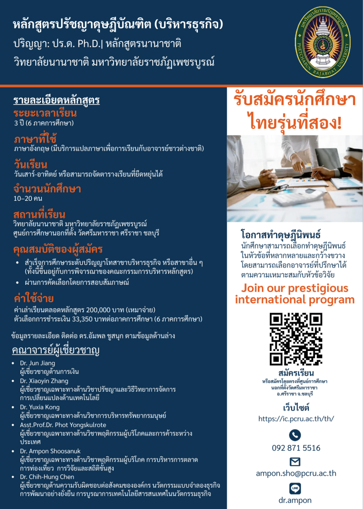 - Tags: ปริญญาเอก, PhD, บริหารธุรกิจ, นานาชาติ, รับสมัคร, ศรีราชา, 2569